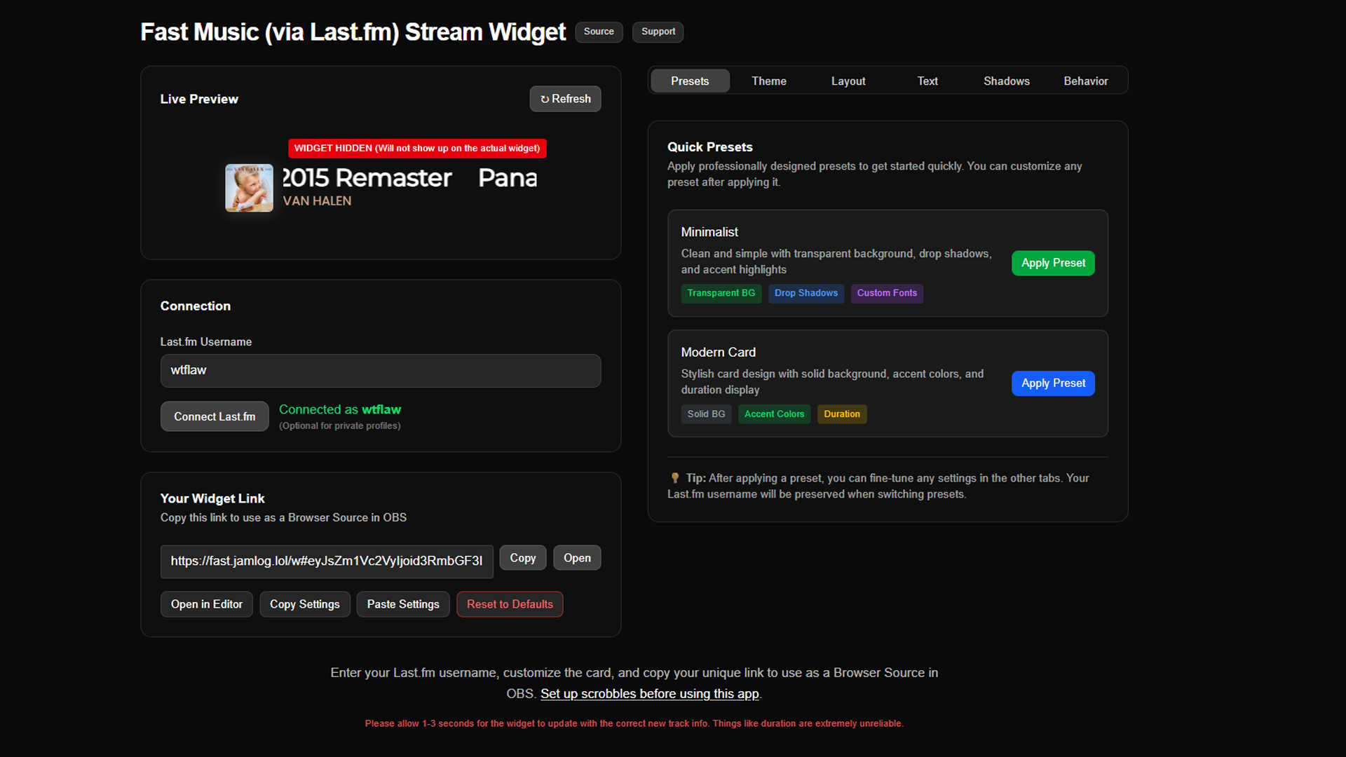 Nothing I found hit all of those and most SaaS overlays gate private scrobble access or hide themes behind paywalls. So I built a Next.js widget that encodes its full config in the URL hash (no server persistence) plus localStorage caching for edits.